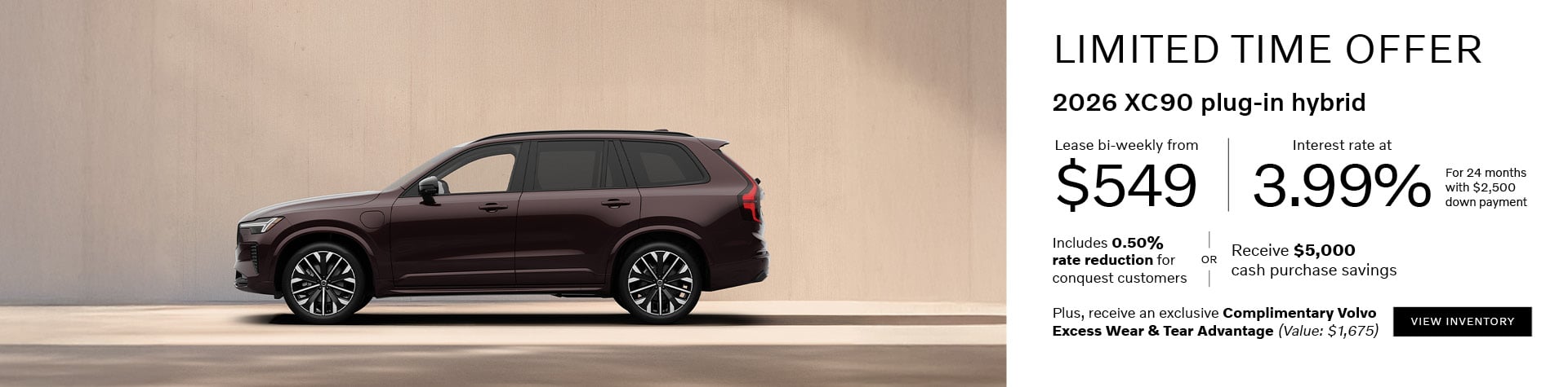 *Limited time lease offer provided through Volvo Car Canada Limited on approved credit. Representative lease offer based on a new and previously unregistered 2026 Volvo XC90 T8 plug-in hybrid Plus. Lease Vehicle Price is $94,681. 3.99% lease APR for 24 months is only available to qualifying customers and includes 0.50% reduction for Conquest. Bi-weekly lease payment is $549 – which includes: $2,770 freight and PDI; $100 A/C charge; regulatory fees (up to $11.65); retailer administration fee (up to $699); lien registration fees (up to $120 including lien registering agent fee); as well as all other applicable fees, levies and duties (all of which may vary by region and retailer). 52 bi-weekly payments required. License; insurance; registration; and applicable taxes are extra. Offer includes $2,500 Add Cash (deducted from the negotiated price before taxes). $2,500 down payment, up to $1,200 security deposit and first bi-weekly payment due at lease inception. Total lease obligation is $31,060. 12,000-kilometre allowance per year; charge of $0.16/km for excess kilometres. Complimentary Volvo excess wear & tear advantage offer applicable to all remaining new 2025 XC60 and new 2026 XC90 models (mild hybrid and plug-in hybrid), and exclusively available at Jim Pattison Volvo Cars North Vancouver. Conditions apply. Offer ends October 31, 2025, and is subject to change or cancellation without notice. Contact us for complete details.