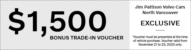 †Based on the current condition, buyout, and accident history of customerʼs current vehicle. *0.49% lease/finance rate (includes 1.5% reduction from Targeted Loyalty Program) applicable to qualifying customers on new 2025 XC40 B5 AWD Ultra models for up to 48/84 months, provided through Volvo Car Canada Limited on approved credit. The Volvo Targeted Loyalty Program is for eligible customers that currently lease or finance a Volvo through Volvo Car Financial Services. **$18,500 cash purchase savings include $17,500 cash purchase savings with $1,000 Targeted Loyalty Program cash purchase savings, applicable on new 2025 EX90 models. ¹Trade-in bonus/voucher must be mentioned or presented at the time of vehicle purchase. ^Complimentary 3-Service Prepaid Maintenance applicable to customers purchasing or leasing a 2026 XC90 B6/T8 Plus or Ultra model. Customers with 24-month lease terms are ineligible for this offer. ‡All customers who register and attend the event will be entered to win a new Apple Watch Series 11 (46mm, GPS + Cellular) [Value: $719+tax]. The draw for the prize will be made within a week after the sales event ends from those who registered for the event, and the winner will be contacted accordingly. The winner of the contest will be required to correctly answer a skill-testing question before the prize will be awarded. No cash value. Offers valid November 21-23, 2025 only. Some conditions and restrictions may apply. Errors and omissions excepted. Offers subject to change or cancellation without notice. Contact Jim Pattison Volvo Cars North Vancouver for complete details.