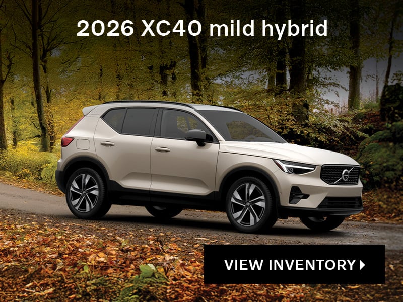 *Limited time lease offer provided through Volvo Car Canada Limited on approved credit. Representative lease offer based on a new and previously unregistered 2026 Volvo XC40 B5 AWD Plus with optional Metallic Paint and 20-inch wheel upgrade. Lease Vehicle Price is $57,231. 1.99% lease APR for 48 months is only available to qualifying customers. Bi-weekly lease payment is $299 – which includes: $2,770 freight and PDI; $100 A/C charge; regulatory fees (up to $11.65); retailer administration fee (up to $699); lien registration fees (up to $120 including lien registering agent fee); as well as all other applicable fees, levies and duties (all of which may vary by region and retailer). 104 bi-weekly payments required. License; insurance; registration; and applicable taxes are extra. Offer includes $1,000 Add Cash (deducted from the negotiated price before taxes). $2,400 down payment, up to $1,200 security deposit and first bi-weekly payment due at lease inception. Total lease obligation is $33,552. 12,000-kilometre allowance per year; charge of $0.16/km for excess kilometres. Conditions apply. Offer ends December 1, 2025, and is subject to change or cancellation without notice. Contact us for complete details.